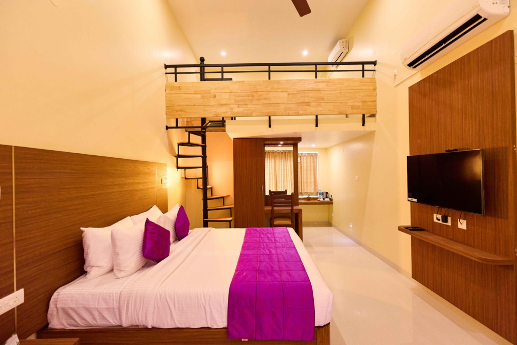 Our Duplex Delight Room, located on the first floor with a private balcony, features a stylish mezzanine layout designed like a duplex, complete with a cozy space for kids’ beds. Ideal for families, this spacious room blends comfort and convenience while offering a refreshing view of the swimming pool. Thoughtfully equipped with all essential amenities, it promises a relaxing and enjoyable stay for both leisure and family travelers.